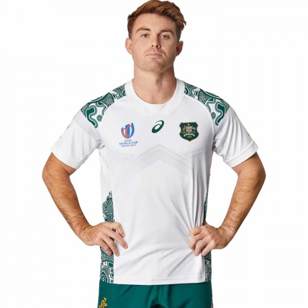 The Australia national team brings a clean and modern look for global supporters with this 2023 away jersey. The white base is paired with green detailing on the shoulders and sides, along with the Wallabies crest and tournament emblem on the chest, reflecting the pride of Australian rugby fans worldwide.