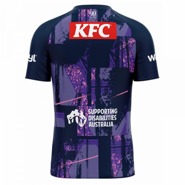 Canterbury-Bankstown Bulldogs supporters will recognise this tee through its dark navy base and bold purple graphic pattern. The 2025 Captains Run design gives fans a fresh way to wear Bulldogs colours before match day and through the wider season.