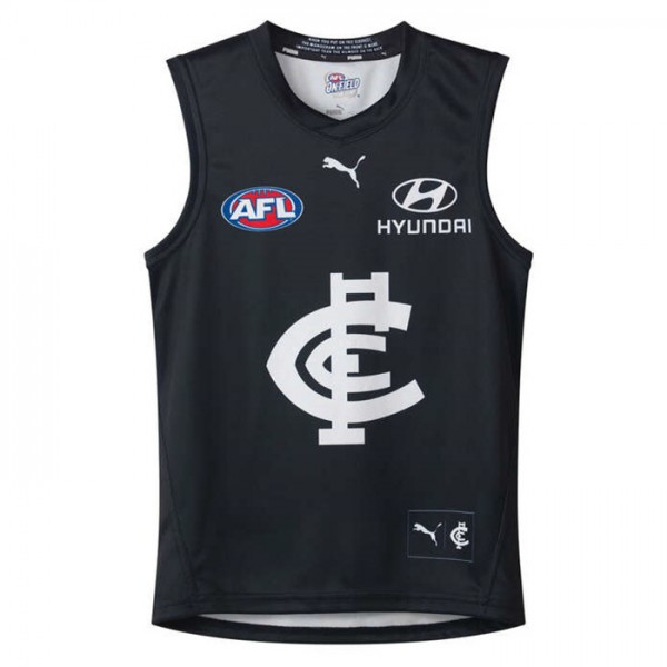 The large chest logo, front sponsor marks, and woven tag complete the Carlton Blues finish.