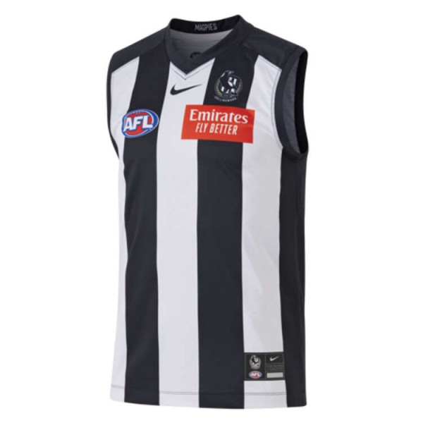 Worn proudly by Collingwood Magpies fans worldwide, this 2023 jersey showcases the club’s iconic black and white stripes with a clean sleeveless cut and strong visual contrast across the front panel.