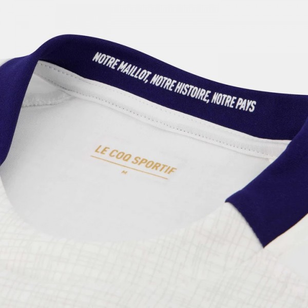 White base with blue sleeve and side accents, plus France crest and tournament logos on the chest