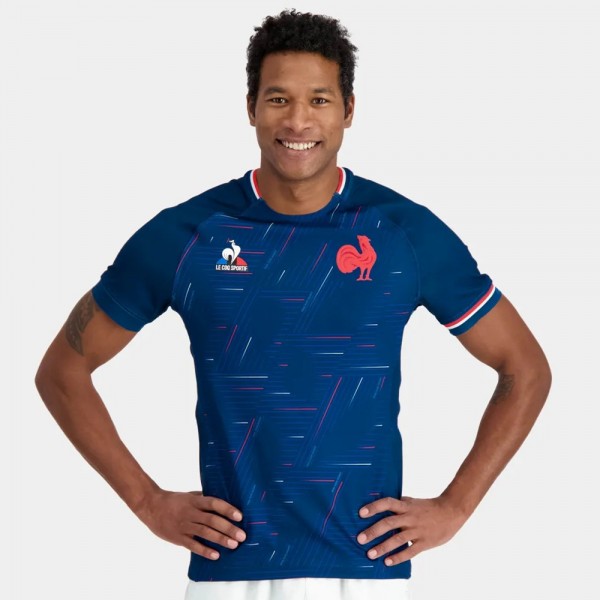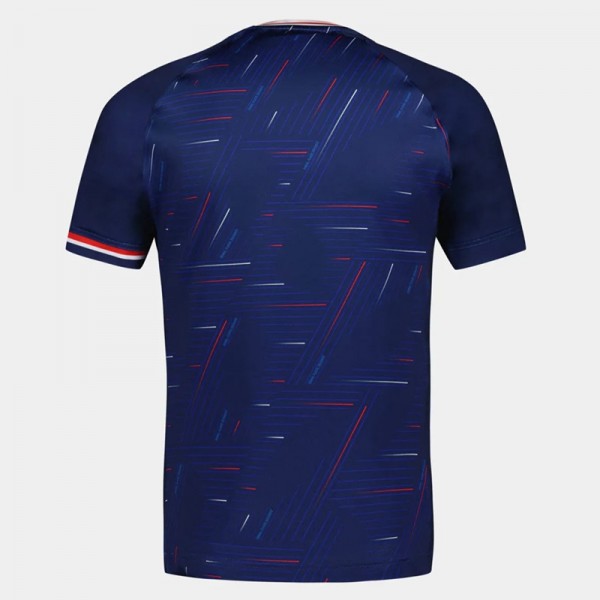 The France Sevens Mens Pre-Match Jersey 2023 brings together supporters across the world with a modern French rugby look. The deep blue base features subtle red and white streak patterns, with the rooster crest placed on the chest to represent the team.