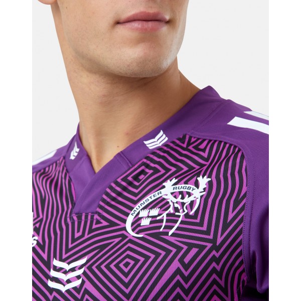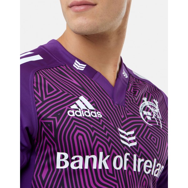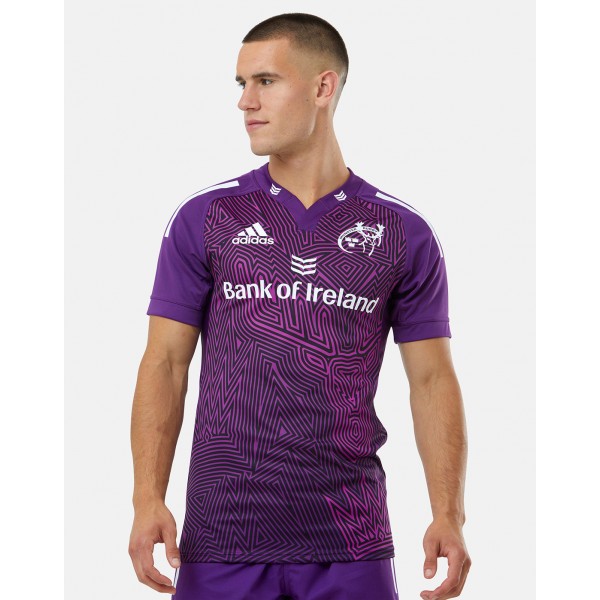 Purple base with detailed line pattern, Munster crest, adidas logo, and sponsor on chest