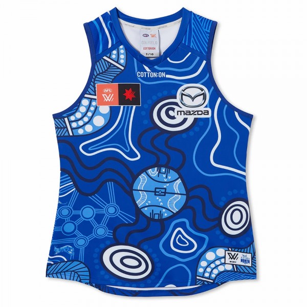 North Melbourne Kangaroos supporters worldwide appreciate designs that reflect both performance and meaning. This jersey showcases a bold blue palette with layered Indigenous-inspired artwork, creating a visually striking look in any crowd.