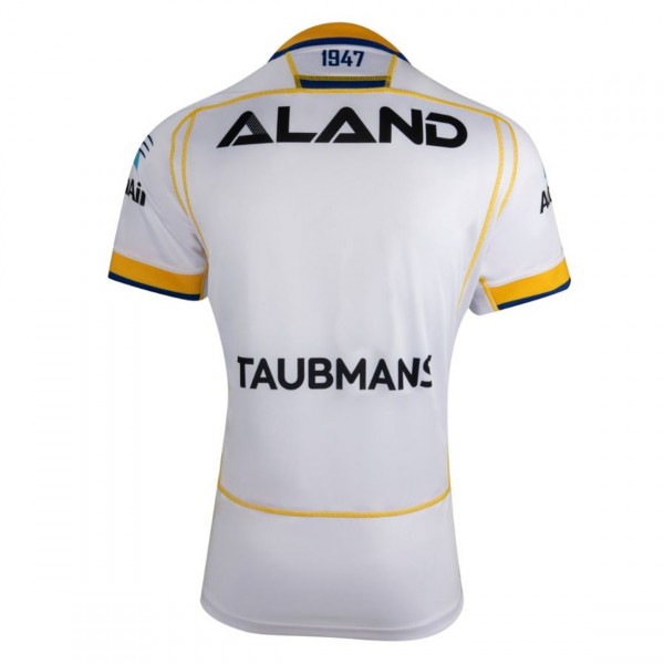 Support the Parramatta Eels wherever you are with this 2023 away jersey, featuring a clean white base highlighted by bold blue and yellow striping. The chest shows the Parramatta Eels crest alongside strong sponsor graphics, giving it a clear and recognisable club look for global supporters.