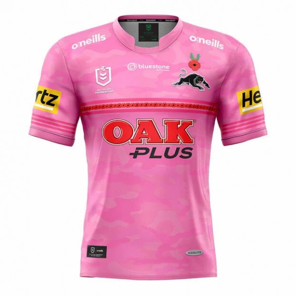The Penrith Panthers Mens Commemorative Jersey 2023 brings supporters together through a meaningful ANZAC tribute. The pink base with a subtle camouflage pattern stands out, while the red poppy band across the chest and rosemary detail above the club crest reflect remembrance shared by fans across Australia and beyond.