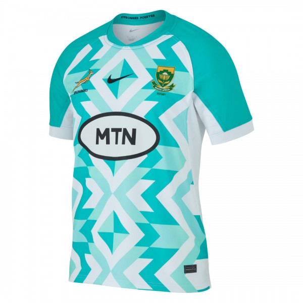 The South Africa Springboks Mens Away Jersey 2023 reflects the spirit of the team and its global supporters. The bold teal base with geometric patterns draws from South African landscapes, while the crest on the chest connects fans worldwide to the Springboks legacy.