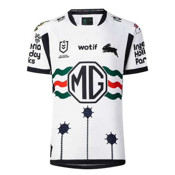 Chest badge details, sponsor graphics, and Rabbitohs markings complete the club look across the front and sleeves.