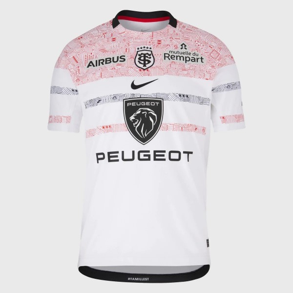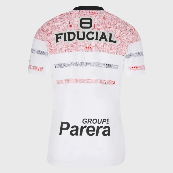 Stade Toulousain is one of France’s most recognised rugby clubs, with supporters across Europe and beyond. This away jersey features a clean white base with red digital-style patterns across the upper chest and sleeves, along with the club crest and sponsor logos placed centrally for a sharp match-ready look.