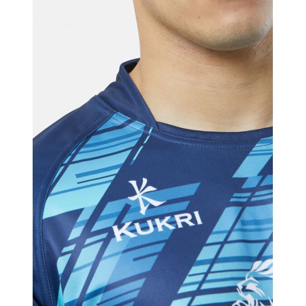Features navy base, angular light blue graphics, front sponsor and chest logos