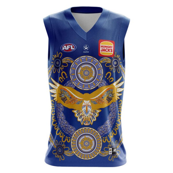 Blue base with gold Indigenous artwork, eagle graphic, AFL and sponsor logos on the chest